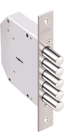 Замок врезной Гранит 1.06.01 предназначен для дверей усиленной конструкции. Соответствует 4 классу. Кодовый механизм сувальдного типа обеспечивает более 1,5 млн. комбинаций. 5 ригелей диаметром 18 мм, замок без тяг. Цвет: никель.